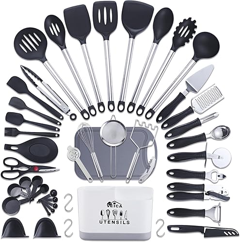 46PCS COKING UTENSILS- this 46piece essentials set including everything you need to cook perfect dish, including Nylon cooking spatula, spoons, turners, skimmer,ladle /silicone spatulas for baking /different s.s. function gadgets /cutting board and knife/measuring cups and spoons HIGH QUALITY NYLON TOOLS- these nylon heads cooking tools prevent your nonstick cookware from scratching and damage. The high quality 430 stainless steel handles are durability and solid. COOK SAFELY WITH FOOD GRADE SILICONE-all of our silicone spatulas are crafted from FOOD GRADE SILICONE FASHION STYLE-the colorful designs could make your kitchen decoration with modern styles. CUSTOMER SERVICE - Please, if you have any questions or issues regarding the VEICA kitchen utensils set please do not hesitate to send the seller a message through Tienda we will respond within 24 hours.