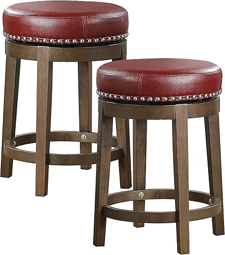 Composición tejido: 70% PVC, 20% fibra de poliéster, 10% algodón Un par de taburetes redondos giratorios de altura en acabado marrón Cuenta con parte superior de asiento tapizada roja con ribete de cabeza de clavo Base de madera con acabado marrón con giro de 360 grados Altura del asiento: 25 pulgadas; Profundidad del asiento: 16. 5 pulgadas; capacidad de peso: 250 libras Se envía en 1 caja y requiere montaje