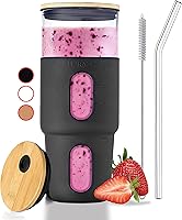 Vaso de vidrio de 32 onzas con popote y tapa de bambú con funda de silicona, vaso de café helado reutilizable, se adapta al soporte de vasos,