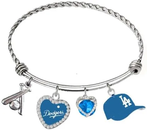La pulsera perfecta para cualquier fan de Los Dodgers. Los dijes no contienen plomo ni níquel. Estos dijes cuelgan de una pulsera trenzada de acero inoxidable en tono plateado. 4 dijes incluyen: - Abalorio de corazón de cristal LA - Abalorio de corazón de cristal brillante - Bate y bola en tono plateado - Charm de tapa de los Dodgers con acabado esmaltado. La pulsera: brazalete trenzado ajustable de acero inoxidable. Hipoalergénico.