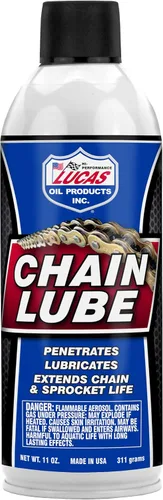 Lucas Chain Lube es un lubricante en aerosol semisintético de bajo olor diseñado para satisfacer las demandas de las cadenas y piñones de motocicletas de alto rendimiento de hoy en día. Probado por profesionales y equipos de carreras competitivos, el aerosol lubricante de cadena Lucas es perfecto para mantener tu cadena en perfectas condiciones de larga duración, y un mínimo de cabestrillo.