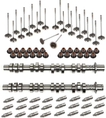 Este artículo incluye: 1 Árbol de levas izquierdo (izquierda - lado del conductor) 1 Árbol de levas derecho (derecha - lado del pasajero) 24 levantadores/ajustador de pestañas 16 válvulas de admisión (3 ranuras; cabeza 1.331 in x vástago 0.236 in x longitud 4.618 in) 8 válvulas de escape (3 ranuras; cabeza 1.476 in x vástago 0.235 in x longitud 4.583 in) 24 sellos de vapor de válvula