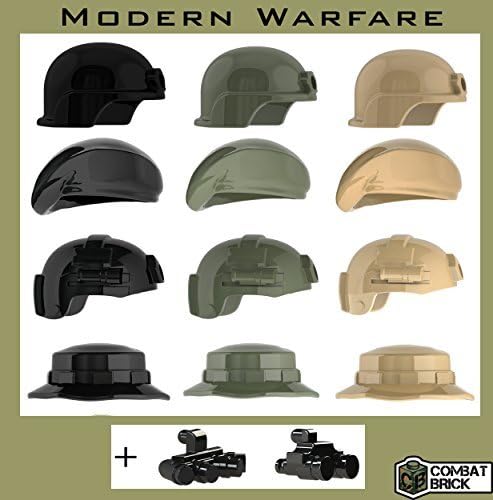 Custom tocados y cascos compatible con Lego minifigura Paquete de 14 por combatbrick. com Plástico ABS moldeado por inyección piezas, 4 diseños en 3 colores: negro, verde militar y Desert Tan además de dos tipos de anteojos de visión nocturna (visión nocturna) en negro casco de combate avanzado (abierto), visión nocturna compatible), boina, las fuerzas especiales Peso ligero casco (NVG balístico compatible), sombrero de explorador Adecuado para el juego o la recogida activo. Este juguete es una excelente idea de regalo de día festivo o un regalo de cumpleaños. Lego es una marca registrada del grupo LEGO que no, autorización o entre el contenido de este producto.