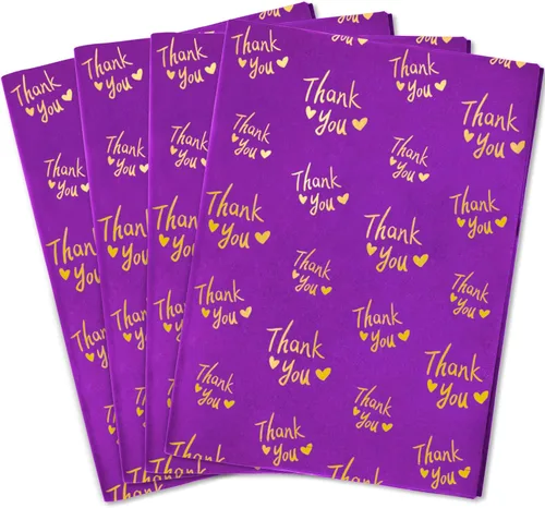 El paquete incluye: 100 hojas de papel de seda dorado morado a granel. Tamaño: 19.7 x 13.8 pulgadas. Recuerda que este tamaño de pañuelo puede no ser adecuado para empacar regalos de gran tamaño. Diseño dorado de agradecimiento: el papel de seda tiene un fondo morado y un patrón de agradecimiento dorado. Es muy hermoso. Papel de seda morado perfecto para pequeñas empresas. Material ecológico: el papel de seda de agradecimiento dorado morado está hecho de papel de alta calidad, respetuoso con el medio ambiente. Alta calidad: el papel de seda morado de agradecimiento está hecho de papel de alta calidad, no es fácil de romper. El patrón dorado de agradecimiento es claro y brillante, adecuado para envolver pequeños regalos y empaques de negocios. Ten en cuenta que estos papel de seda de regalo están impresos en un lado. Ampliamente utilizado: puedes utilizar este papel de seda para envolver tus regalos de cumpleaños, día de la madre, día de Acción de Gracias, baby shower, Navidad y Año Nuevo. También puedes convertirlos en pompones de papel y otras decoraciones de fiesta.