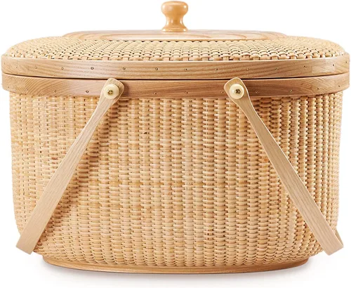 Nantucket Cesta de Costura, Tejido de Caña sobre Caña, Fresno Duro, Ovalada, Con Tapa y Asas de Madera