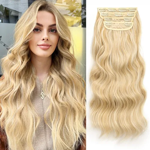 Nnzes Extensiones de cabello largo ondulado con clip, 4 piezas, extensiones de cabello grueso de doble trama de 20 pulgadas, mezcla de rubio