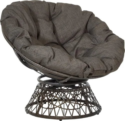 Disfruta del estilo bohemio de nuestra silla papasan hecha con mimbre de resina duradero envuelto sobre un marco de metal. Descansa y gira y revuelve a tu gusto con un giro de 360 grados prácticamente sin fricción. Descansa y relájate en el cojín extraíble con botones de alta calidad, generosamente grande y relleno de dacrón suave. Es fácil quitar el polvo y los desechos del cojín del asiento ya que está atado al marco con correas. Tamaño total: 40 pulgadas de ancho x 36 pulgadas de profundidad x 35.25 pulgadas de alto; tamaño del asiento: 40 pulgadas de diámetro x 4.5 pulgadas de grosor; tamaño del respaldo: 40 pulgadas de ancho x 18 pulgadas de alto x 4.5 pulgadas de grosor