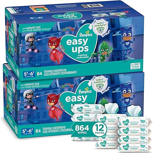 Pampers Easy Ups - Pantalones de entrenamiento para niños y niñas, 5T-6T (talla 7), suministro de 2 meses (2 x 84 unidades) con toallitas sensibles