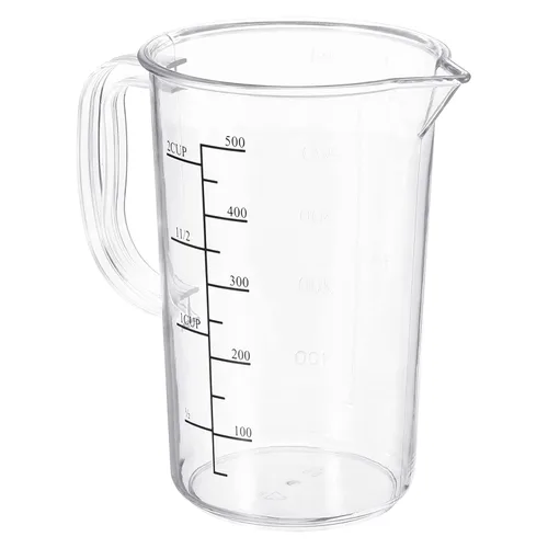 Aplicación: El vaso graduado está diseñado para medir, transferir y almacenar el líquido en el laboratorio o en el hogar, presenta graduaciones de doble cara con diferentes mediciones, y con un mango y boquilla cómodos, es una gran herramienta incluso en el laboratorio. Material: PC (policarbonato); Capacidad: 16.9 fl oz; Tamaño total: 2.8 x 3.9 x 5.3 in / 2,76 x 3,94 x 5,31 pulgadas (parte inferior D* Top.D* H); Lista del paquete: 1 x vaso graduado Ventaja: Hecho de plástico de PC, con buena resistencia a altas y bajas temperaturas, fuerte dureza, no es fácil de romper al caer, puede servir mucho tiempo en el uso diario. Caño cónico para verter y transferir líquidos fácilmente, con un mango cómodo para un levantamiento fácil y cómodo. Instrucciones: Hay graduaciones precisas en cada lado del vaso de precipitados en diferentes medidas, claro y no fácil de desvanecer, puede medir el líquido que desea más convenientemente. Aviso: El vaso tiene cierta resistencia al calor, pero no puede ser un recipiente de calentamiento directo.