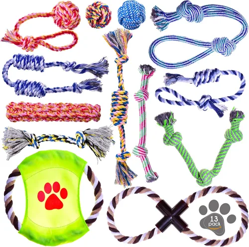 Material de algodón duradero: hecho de 100% algodón lavable, cada juguete de cuerda es seguro, ecológico y suave con los dientes y las encías. Diseñado para cachorros y razas pequeñas: tamaño para perros jóvenes y pequeños que disfrutan de tirar, masticar y jugar interactivamente. Paquete variado de 13 piezas: incluye múltiples formas y diseños para buscar, tira y afloja y entretenimiento en solitario en interiores o exteriores. Apoya la salud dental: las fibras de algodón ayudan a limpiar los dientes y masajear las encías durante la masticación, fomentando una mejor higiene bucal. Divertido, lavable y portátil: los colores brillantes mantienen a las mascotas comprometidas; el diseño lavable a máquina garantiza una fácil limpieza y un uso duradero.