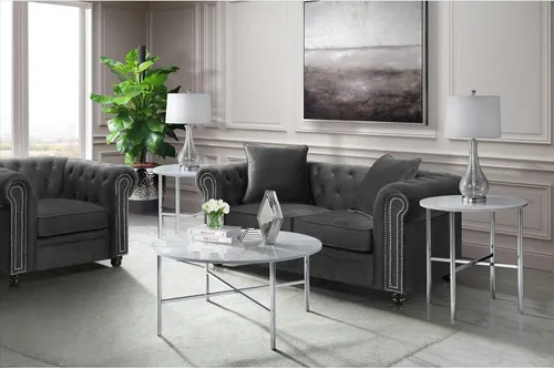 El juego incluye: mesa de centro y dos mesas auxiliares Diseño contemporáneo Patas de metal cromado Blanco, tablero de mármol sintético Base de mesa fresca y cruzada Forma redonda