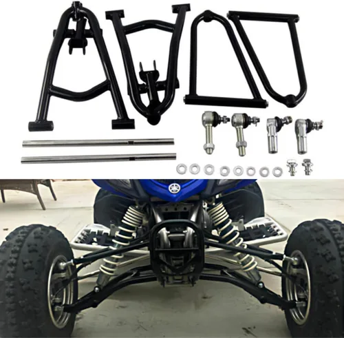 Ajuste del vehículo: Brazos A para Yamaha Raptor 660R 2001 2002 2003 2004 2005 El paquete incluye: 2 x Brazo A delantero izquierdo 2 x Brazo en A delantero derecho 4 rótulas (Las juntas esféricas superiores e inferiores están incluidas, no requiere escariado del husillo) Características: - Hecho de material de acero inoxidable T304 de alta calidad. -Instalación atornillada directa, no requiere modificación. - Añade 2 pulgadas cada lado para un extremo frontal de 4 pulgadas más ancho. -Totalmente ajustable a través de las rótulas inferiores. - No es necesario quitar el brazo para ajustarlo como muchas otras marcas. Ajuste de 3 vías cambiando los espaciadores en el brazo superior - para todo tipo de terreno, MX, desierto. -El diseño curvado de nuestros brazos te brinda la máxima distancia libre posible en surcos y otros obstáculos.