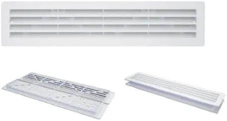 Rejilla de transferencia de puerta de plástico-PKM PKM: Diseño especial para montaje en puerta para sistemas de ventilación y aire acondicionado que funcionan a baja y media presión. Permite la circulación del aire, superponiendo cuchillas en forma de V. Visión general: PKM: Diseño especial para montaje en puerta para sistemas de ventilación y aire acondicionado que funcionan a baja y media presión. Permite la circulación del aire, superponiendo cuchillas en forma de V. El diseño aerodinámico ofrece una pérdida de presión muy baja. Conveniente para la aplicación de pared y techo. Características del producto: El sistema con tornillos ocultos a medios es el estándar. Ambas partes de la parrilla están unidas por tornillos Se puede aplicar con adhesivo. Plástico ABS blanco estándar. Varias opciones de color bajo demanda