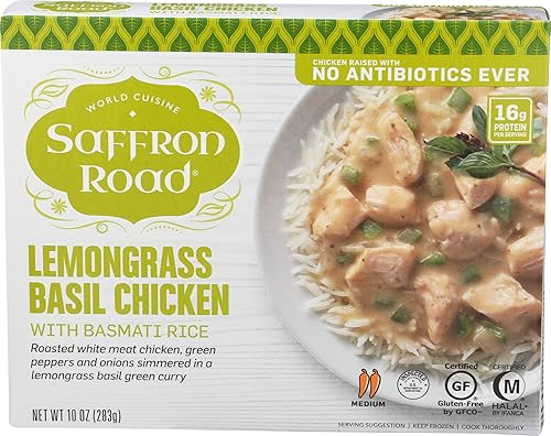 ¿Para qué sirve Saffron Road Cena congelada de pollo de albahaca con arroz basmati, 10 onzas, sin antibióticos, sin gluten, Halal?
