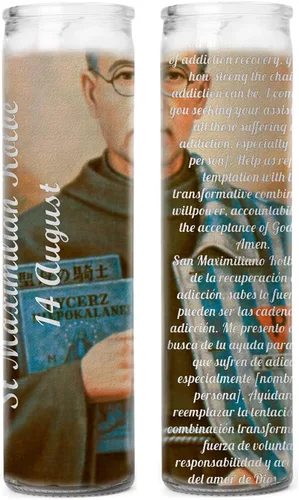 Dos velas de oración devocional con imagen en color de Maximillian Kolbe Una tarjeta de oración bendita gratis Incluye una tarjeta con la fecha en que tu artículo fue bendecido Maximilian Kolbe es el patrón de las personas con adicción a las drogas
