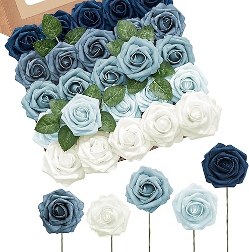 Flores artificiales vívidas: estas rosas artificiales están hechas de espuma de látex suave ecológica de alta calidad que hace que las flores falsas se vean realistas, colores vivos, material de tacto real. No requiere mantenimiento ni mantenimiento, nunca se desvanecen ni mueren, se mantienen frescos y hermosos año tras año Flores de boda vibrantes: cada cabeza de rosa mide aproximadamente 3 pulgadas, el tallo mide aproximadamente 8 pulgadas de largo, la altura total es de 9 pulgadas. Con 5 colores combinados, azul marino, azul polvoriento, azul claro, blanco para embellecer diferentes romances, más adecuado para ramo de novia, decoración de habitación o fiesta Rosas artificiales versátiles: perfectas para hacer ramos, centros de mesa, bolas de beso, boutonnieres, flores de pastel o cualquier otra decoración de flores en tu boda, despedida de soltera, fiesta, baby shower o decoración del hogar Haz tu felicidad: todas las rosas se instalan con tallos flexibles de 8 pulgadas, que son fáciles de doblar, cortar o extraer. Puedes crear cualquier estilo artístico sin preocupaciones. Cada flor artificial puede hacer un ramo de novia de aproximadamente 8 a 9 pulgadas Serwalin es una marca que se centra en la decoración de bodas y el hogar, contamos con un equipo de diseño profesional para combinar con el combo de flores, equipo de control de calidad para garantizar la calidad del producto, puedes elegirnos sin ninguna preocupación