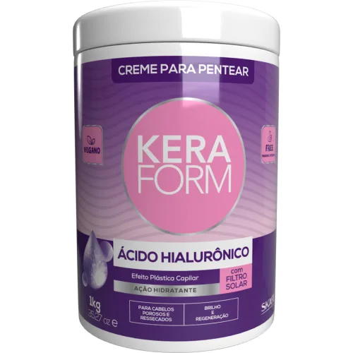 Desarrollada para todo tipo de cabello, especialmente para cabellos extremadamente deshidratados, Keraform Hyaluronic Acid Styling Cream garantiza un acabado perfecto. Con una fórmula exclusiva, su acción consiste en proporcionar retención de humedad y mayor resistencia, rellenando y regenerando la fibra capilar. Efecto cambio de imagen del cabello: Rápidamente absorbido por el cabello debido a su bajo peso molecular, ayuda a prevenir el cabello seco, seco y poroso intensamente. Ofrece una suavidad notable, alineación y resultados de brillo extra. --------------- Desenvolvido para todos los tipos de cabello, em especial para os extremamente desidratados, o Creme para Keraform Pentear ácido Hialurónico garante perfeita finalizacao. Com formula exclusiva, sua acao consiste em promover retencao da hidratacao e maior resistencia, encorpando e regenerando a fibra capilar. EFEITO PLaSTICA CAPILAR: Absorvido rapidamente pelos fios devido ao seu baixo peso molecular, combate os fios secos, ressecados e porosos de forma intensiva. Oferece resultado perceptivel de maciez, alinhamento e super brilho, gracas a reposicao da umidade para os fios.