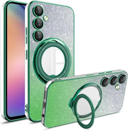 SKYLMW Funda para Samsung Galaxy A54 5G con purpurina y soporte de anillo giratorio compatible con MagSafe, funda transparente chapada con protector