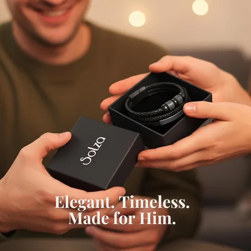 Construcción trenzada de triple hilo: dos cordones de cuero trenzado de precisión y una correa de cuero lisa plana están unificados con cuentas de acero inoxidable 316 chapado en negro IP, forjando una pulsera de brazalete para hombre en capas audaces diseñada para durar. Cierre de botón con seguridad cero fusible: el mecanismo de botón de acero inoxidable 316 negro mate se bloquea firmemente con una sola pulsación y se libera limpiamente, manteniendo esta pulsera de cuero para hombre sujeta a través de entrenamientos, viajes y uso durante todo el día. Dimensiones de ajuste preciso para comodidad durante todo el día: con 8.2 pulgadas de largo, 1.6 pulgadas de ancho y solo 1.06 oz, esta pulsera de cuero negro para hombre es lo suficientemente sustancial como para llamar la atención pero lo suficientemente refinada para llevar la muñeca sin esfuerzo durante todo el día. Estética monocromática negra que eleva cualquier atuendo: los herrajes chapados en negro IP y el cuero mate ofrecen un aspecto cohesivo y refinado, esta pulsera unisex lleva sin problemas desde atuendos de oficina y ocasiones formales hasta fines de semana casual y viajes. Llega listo para regalo en una caja premium: cada pulsera se envía dentro de una caja de regalo rígida de la marca Solza con interior satinado, lo que hace de esta pulsera de cuero para hombre un regalo completo para cumpleaños, día del padre, Navidad o graduación.