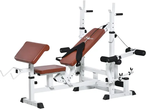 otras Gimnasio en casa: el banco de pesas multifuncional cuenta con una almohadilla de rizo de predicador, máquina de extensión de piernas, press de banca, máquina de mosca de pecho y bandas de resistencia. Esto te permite entrenar tus piernas y la parte superior del cuerpo, ejercitando los bíceps, tríceps, cuádriceps, isquiotibiales y glúteos en cualquier momento en casa. Ajustabilidad: Nuestro banco de pesas olímpico está diseñado con un respaldo de 5 posiciones, un estante de barra ajustable en altura, coderas y almohadillas de rodillo para una posición de entrenamiento ergonómica y óptima. Además, terminamos el gimnasio en casa con un cojín suave para minimizar la fatiga y permanecer cómodo mientras entrenas. Bastidor de pesas: equipado con un estante de peso libre para adaptarse a placas estándar (peso máximo 55 libras), puede aumentar o disminuir fácilmente el peso de acuerdo a su propio nivel, haciendo así el ejercicio más efectivo. Construcción sólida: nuestro estante para press de banca está hecho de tubo de acero reforzado con recubrimiento en polvo para un uso a largo plazo, y con superficie de PU es fácil de limpiar. El diseño compacto proporciona un soporte óptimo para la práctica diaria. La mejor opción para el hogar, la oficina y el gimnasio Prensa de banco para gimnasio en casa Dimensiones totales: 82.75 pulgadas de largo x 43.25 pulgadas de ancho x 40.5 pulgadas de alto, capacidad de peso: 264 libras;
