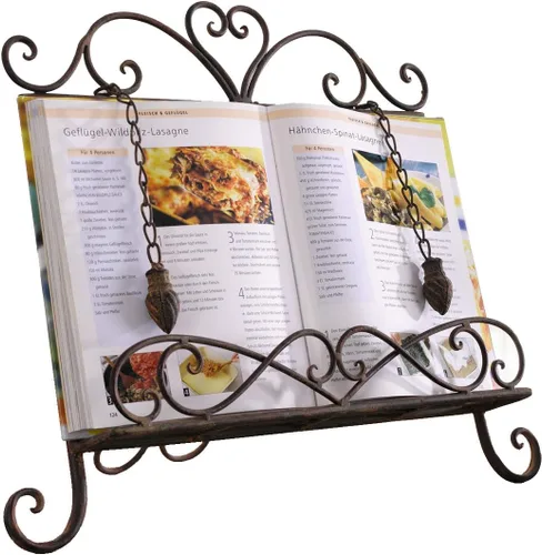 Enamórate de este encantador soporte de metal antiguo para libros de cocina. Proporciona el descanso perfecto para tu libro de cocina, por lo que nunca tendrás que preocuparte por olvidar las recetas familiares. El caballete multifuncional para libros de cocina tiene un panel trasero adornado que muestra un elegante patrón de corte de Fleur De Lis. Los rollos decorativos en la parte superior se combinan con rollos a juego en el estante inferior para un toque de estilo. Dieciséis pulgadas de ancho con una bandeja de 1.75 pulgadas de profundidad, este soporte para iPad se adapta a la mayoría de las tabletas, por lo que puedes ver tus videos de cocina favoritos o programas de televisión mientras prepara las comidas. Las cadenas pesadas en cada lado ayudan a mantener los libros abiertos a la página deseada, lo que permite cocinar con manos libres. Coloca el soporte para tablet en una esquina o al lado de cualquier enchufe y úsalo como base de carga para teléfonos y otros dispositivos electrónicos. La pantalla del libro viene con un soporte ajustable, por lo que puedes colocar tu libro de cocina en posición vertical o inclinarlo en el ángulo que prefieras mientras sigues las instrucciones de la receta. El soporte también hace que sea fácil plegar el soporte para libros de recetas vintage para un almacenamiento compacto cuando termines. Con un acabado rústico marrón oscuro, este antiguo soporte para libros de cocina de hierro forjado es un regalo perfecto para cualquier chef en tu vida. Utilízalo para añadir un bonito acento a tu encimera o decoración de mesa durante Navidad, Acción de Gracias, cumpleaños y otras ocasiones.