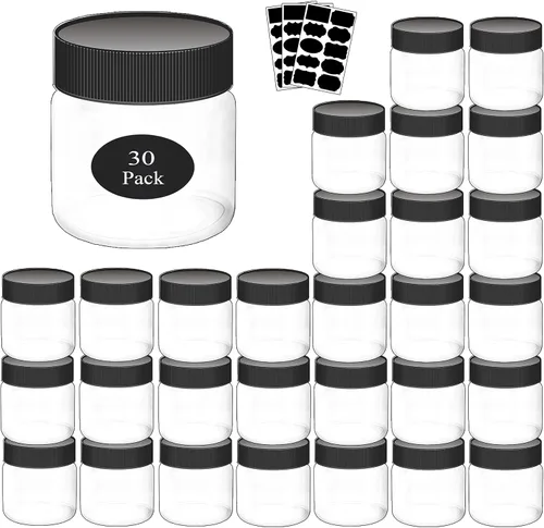 Calidad prémium: estos tarros de plástico con tapas están hechos de material PET de alta calidad y resistentes al impacto, lo que hace que estos recipientes de plástico de 8 onzas con tapas sean ideales para mantequilla corporal o almacenamiento de alimentos saludables [A prueba de fugas y sellado hermético] Los frascos de plástico de 8 onzas con tapas tienen una tapa superior atornillada y una junta integrada que crea un sello hermético para proporcionar una protección completa para tu contenido en el interior. Previene eficazmente las fugas y mantiene la máxima frescura de los alimentos Tamaño y cantidad: estos recipientes de 8 onzas con tapas incluyen 30 tarros de 8 onzas con tapas (tapas negras), además de un marcador blanco y 30 calcomanías negras para etiquetar. El diámetro de la boca de los tarros de plástico con tapas es de 2.6 pulgadas; la altura de los frascos es de 3.35 pulgadas y el diámetro inferior es de 2.75 pulgadas [Perfecto para] Nuestros recipientes con tapas de 8 onzas son ideales para almacenar productos como cereales, pastas, nueces, frijoles, harina, azúcar, granos de palomitas de maíz, semillas, polvos, cecina, a granel, cremas, hierbas, especias, encurtidos, mayonesa, o como un aperitivo o tarro de dulces, también ideal para lociones caseras, fragancias, mantecas corporales líquidos y aceites, y mucho más. Perfecto para despensa y baño para almacenamiento o sala de juegos para suministros de arte y manualidades Ahorro de espacio: el ligero borde alrededor de la tapa evita que los recipientes se deslicen uno encima del otro y ayuda a asegurar estos frascos de almacenamiento en su lugar. El diseño apilable permite que estos frascos ahorren más espacio y quepan eficientemente en tu refrigerador o armario, un juego uniforme de tarros con etiquetas gratuitas te ayuda a que la cocina sea más ordenada, más organizada y más fácil de navegar