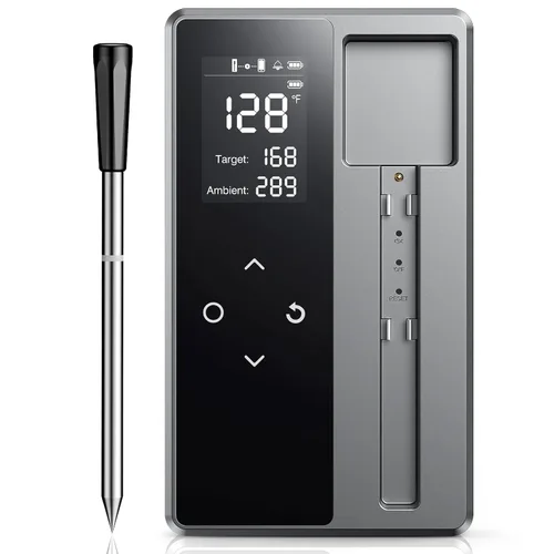 Precisión inigualable: logra lecturas impecablemente precisas cada vez con tecnología de vanguardia que garantiza que tu carne se cocine a la perfección, no más conjeturas, solo precisión con cada cocinero. BASE INTELIGENTE PARA UN CONTROL FÁCIL - La innovadora base te da control total: visualiza lecturas en tiempo real, establece temperaturas objetivo y realiza ajustes directamente, sin necesidad de un smartphone. Cocina inteligente inalámbrica, simplificada Accede a la aplicación inteligente y al sistema de cocción guiada con ajustes preestablecidos aprobados por el chef, instrucciones paso a paso y alertas en tiempo real. Simplifica la cocción con confianza y domina cada bistec, pollo, asado o pescado con facilidad. SONDA ULTRADELGADA DE GRADO ALIMENTARIO – Fabricada con materiales seguros de grado alimenticio, esta sonda ultradelgada soporta temperaturas de -58 °F a 572 °F, ofreciendo lecturas precisas mientras mantiene los jugos y la textura intactos para resultados consistentes de calidad profesional. IMPERMEABLE Y APTO PARA LAVAVAJILLAS: sondas totalmente impermeables y aptas para lavavajillas que hacen que la limpieza sea sin esfuerzo, por lo que tu termómetro siempre está listo para la próxima cocción sin ningún problema. RESISTENCIA DE 100 HORAS – Mantén el poder durante largas cocciones con hasta 100 horas con una sola carga. Perfecto para asar lentamente pavos, barbacoas de fin de semana o aventuras de camping. La recarga rápida USB-C garantiza una libertad de cocción ininterrumpida. Todos los métodos, en cualquier lugar: compatible con estilos de cocina en interiores y exteriores: barbacoa, ahumador, horno, estufa, sous-vide, asador, freidora de aire, fogata o plancha, ofreciendo precisión confiable dondequiera que cocines. El mejor regalo para los amantes de la comida: sorprende a los entusiastas de la barbacoa, chefs caseros y amantes de la comida con un termómetro inalámbrico inteligente para carne que aporta precisión y comodidad a cada cocinero. Ideal para cumpleaños, vacaciones, bodas o inauguraciones de la casa, creando comidas memorables y regalos inolvidables.