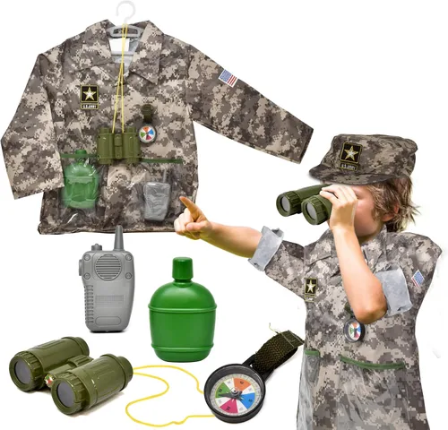 • US Army Juego de roles: el juego incluye uniforme del ejército, gorra del ejército, walkie talkie, binocular, cantina y brújula Juego de simulación: el juego de simulación es una parte importante del crecimiento y a tu pequeño le encantará transformarse en un héroe de la vida real Haz que sea una experiencia significativa: este disfraz de soldado de camuflaje militar realista mostrará la valentía de un soldado patriótico a quien lo lleve. Usa este atuendo militar y haz que sea una experiencia significativa Diseño realista: este conjunto de disfraz de soldado está diseñado de manera realista y se ve como el real. ¡Con esta fuerza especial establecida en tu arsenal, estarás listo para derrotar cualquier cosa que se interponga en tu camino! Gran disfraz de Halloween, regalo o juego diario: gran disfraz de Halloween, regalo de fiesta de cumpleaños, ejército/soldado, juego de simulación, escenario, vestido o juego de rol uno a uno durante todo el año.