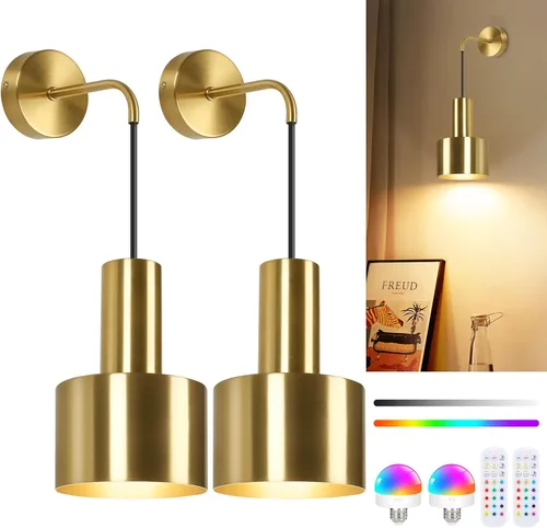 VerRon Juego de dos apliques de pared recargables con batería, luces doradas inalámbricas con batería con bombillas desmontables y control remoto