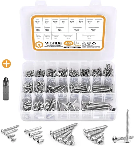 Surtido de tornillos: #4x1/4", #4x3/8", #4x3/4", #4x1", #6x3/8", #6x1/2", #6x3/4", #6x1", #8x5/8", #8x3/4", #8x1", #8x1-1/4", #8x1-1/4". 2", #10 x1/2", #10x3/4", #10x1", #10x1-1/4", #12x2". El total es de 460 unidades Material y mano de obra: los tornillos VIGRUE están hechos de acero inoxidable 304 de alta calidad, conocido por su resistencia confiable y rígida, así como por su calidad resistente a la corrosión. La rosca del tornillo es muy afilada y resistente KIT DE SURTIDO PRACTICO: El juego de tornillos incluye 460 tornillos, que contiene la mayoría de los tamaños utilizados diariamente. Estos tornillos con punta ayudan a penetrar el material, se pueden aplicar sobre estructuras de metal, madera o plástico. Estuche práctico: este kit de tornillos está organizado por tamaño en una caja de almacenamiento transparente de plástico resistente, está organizado para ti Buen servicio posventa: si no estás satisfecho por cualquier motivo, ponte en contacto con nosotros directamente, VIGRUE ofrece un reemplazo o reembolso. Sin problemas, sin retrasos. Si necesita un solo tamaño o una cantidad diferente, bienvenido a contactar.