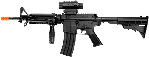 ABS polímero Verdadero 1: 1 escala eléctrica (AEG) Velocidad (FPS): 200 con 0.00 oz BB's Modos de disparo: cargador grande automático/semiautomático completo Linterna táctica para oscuridad requiere (batería incluida) longitud: 31.5 pulgadas Horas ilimitadas de diversión