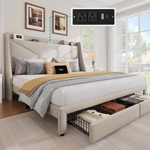 YITAHOME Base de cama de almacenamiento, marco de cama de tamaño matrimonial con puerto tipo C y USB y 2 cajones, cabecera tapizada, plataforma de